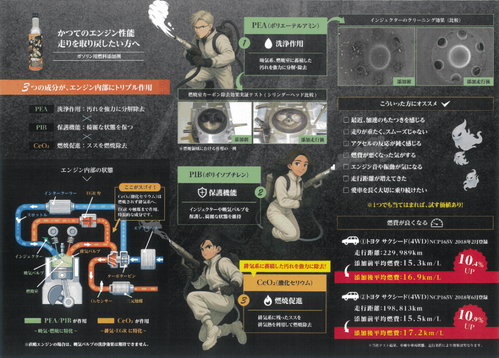 - 強力洗浄(PEA):燃焼室やインジェクターの汚れを分解!